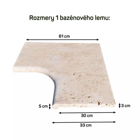 Vnútorný rohový bazénový lem z travertínu sa využíva na ukončenie kamennej dlažby v okolí bazéna, ktorú ponúkame v rovnakých farebných oddieňoch ako bazénové lemy. Kamenný bazénový rohový lem je nenáročný na údržbu a je odolný voči bazénovej chémii a slnečnému žiareniu. Keďže je lem okolo bazéna z prírodného kameňa tak tiež odolá všetkým nepriaznivým podmienkam ako sú vysoké či mrazivé teploty a ani nepriaznivé poveternostné podmienky kamennému lemu nepôsobia problémy. Po inštalácii do okolia bazéna odporúčame bazénový lem rovnako ako dlažbu v okolí bazéna naimpregnovať.