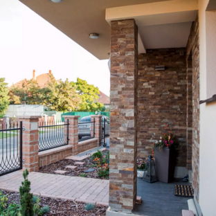 Pílené pásy gneis v hnedej farbe, naformátované z nepravidelného kameňa na presnú výšku. Dĺžka jednotlivých pásikov je rôzna. Takýto obklad je vhodný na vonkajšie obklady ako napríklad obklad na dom, sokel, obklad múriku. Kameň je vhodný aj do interiéru na obklad barového pultu, obklad na stenu do obývačky, na krb. Gneis patrí k nasiakavým materiálom a preto je potrebné ho hneď po nalepení na stenu naimpregnovať. Gneisový tehličkový obklad sa využíva na fasádne obklady, obklad soklov, stĺpov či schodov. Veľmi obľúbený je pre svoj výnimočný luxusný vzhľad, čím sa výborne hodí do glamour štýlu bývania, ktorý oslavuje okázalosť a krásu. No svoje uplatnenie gneis nájde aj v interiéri ako obklad stien a fasády. Zlatá farba krásne kontrastuje so žiarivým zeleným porastom v záhrade. Každá stavba s využitím formátovaného tehličkového obkladu pôsobí nadčasovo a jedinečne.